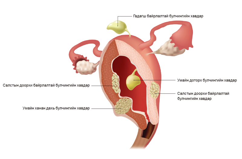 Ихэнх тохиолдолд умайн хананд нэг бус харин янз бvрийн хэмжээтэй хэд хэдэн хоргүй хавдрын зангилаа vvсдэг. Миома нь янз бүрийн байрлалтай байх бөгөөд нэг хэсэг нь умайн хананд , нөгөө хэсэг нь хэвлийн хөндий рvv тvрж, гурав дахь хэсэг нь умайн хөндий рvv тvрж байрладаг (зургаас харна уу).